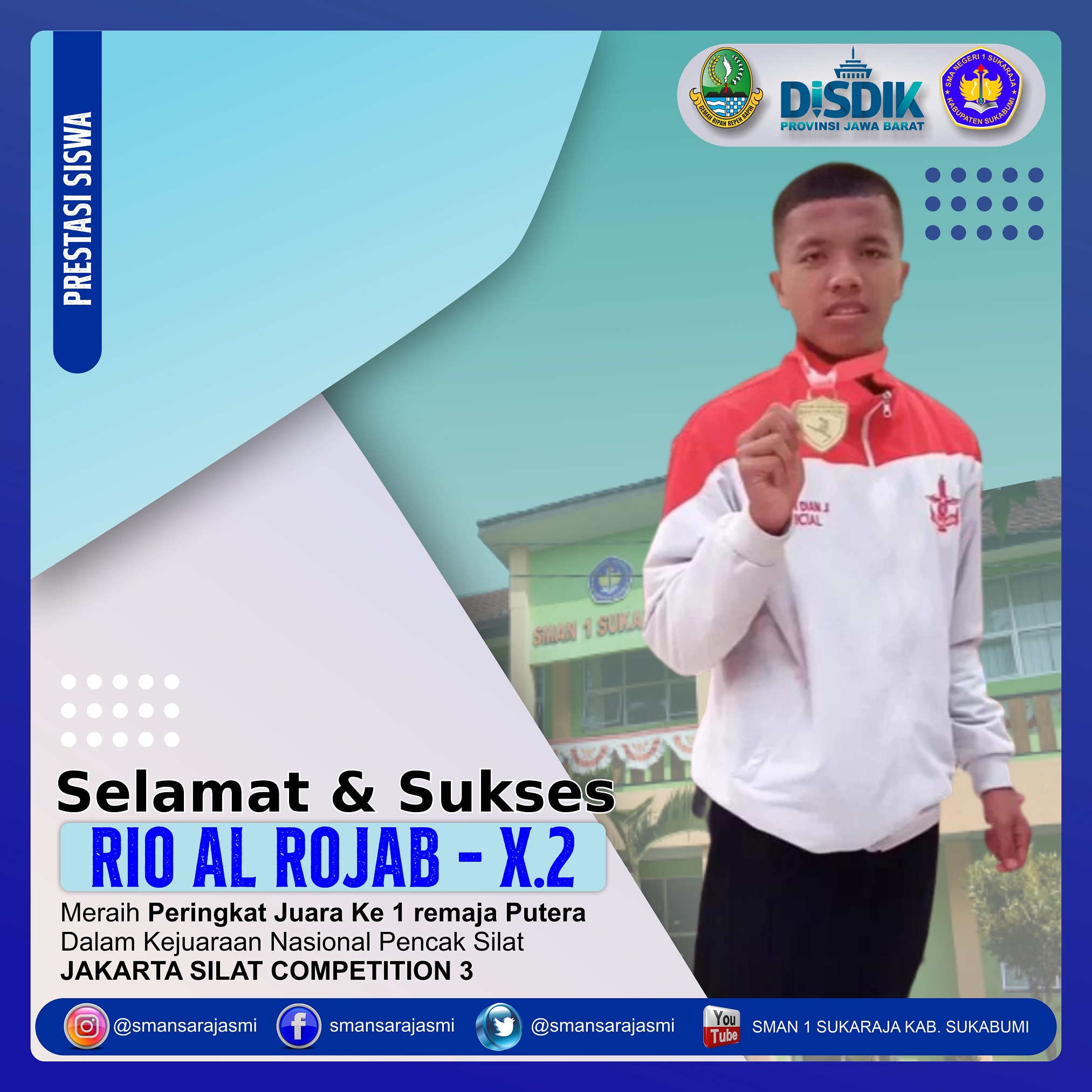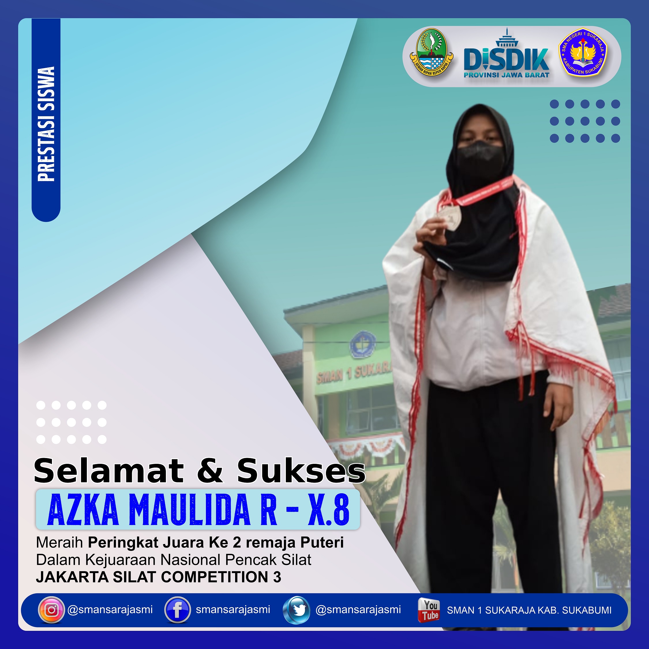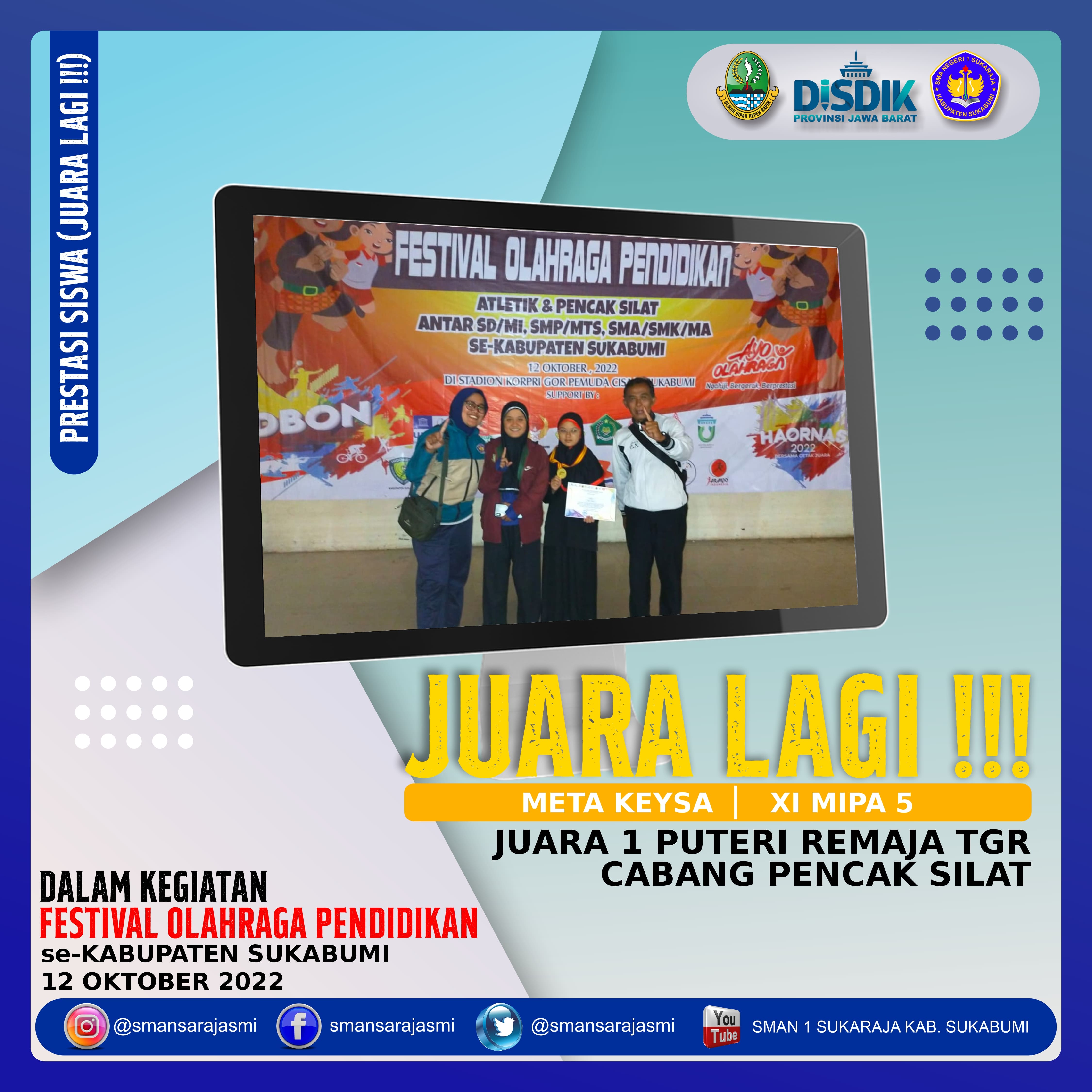 ![]() | juara 1 Puteri Remaja TGR Cabang Pencak Silat dalam kegiatan Festival Olahraga Pendidikan se- Kabupaten Sukabumi. Siswi SMAN 1 Sukaraja kembali torehkan prestasi, kali ini kabar baik datang dari Siswi atas nama Meta Keysa Kelas XI MIPA 5 yang berhasil meraih juara 1 Puteri Remaja TGR Cabang Pencak Silat dalam kegiatan Festival Olahraga Pendidikan se- Kabupaten Sukabumi. |