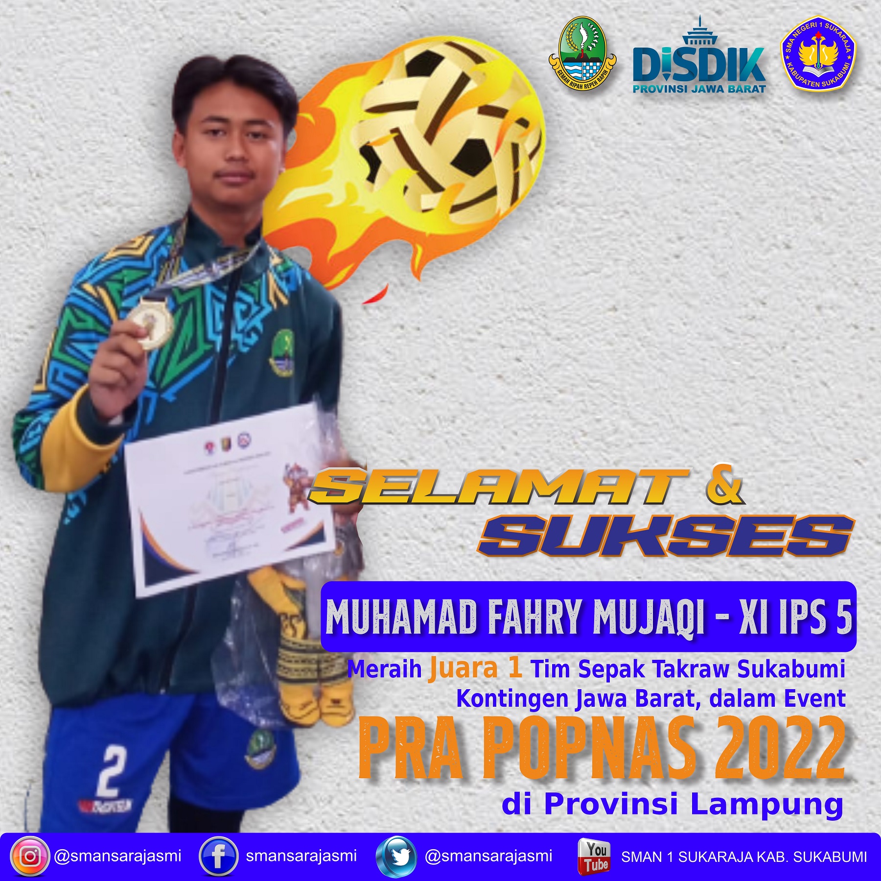 ![]() | Juara 1 Tim Sepak takraw Sukabumi kontingen Jabar pada Pra Popnas 2022 di Lampung |